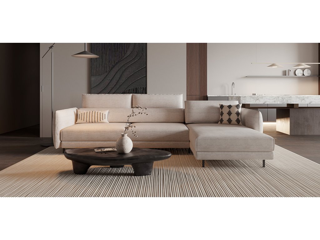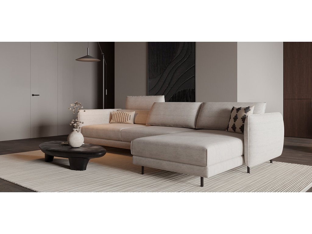 - Nadčasový vzhled bez kompromisů: Čisté rovné linie v dialogu s objemnými polštáři a područkami. Transformační mechanismus je kompletně skrytý pod sedákem – ničím nerušený, elegantní vzhled zůstává.